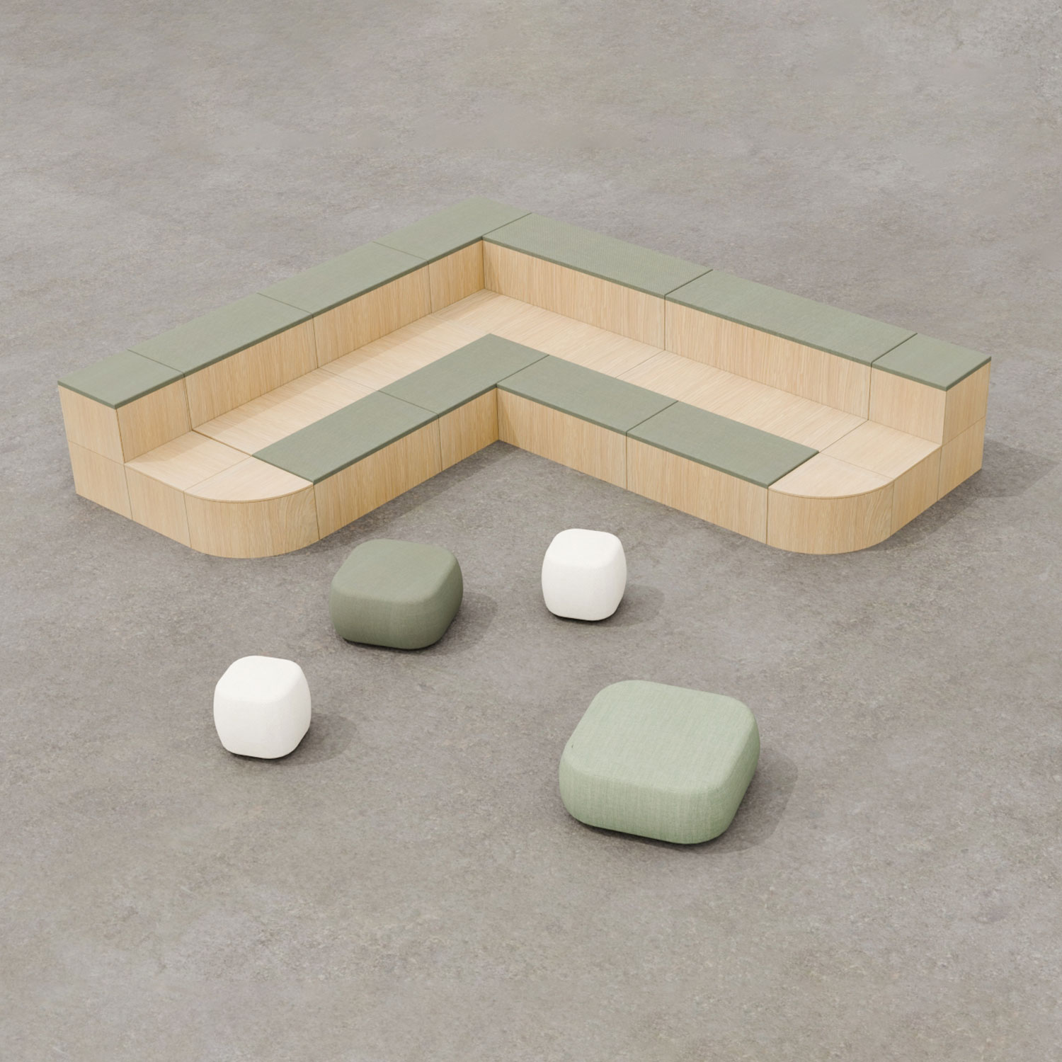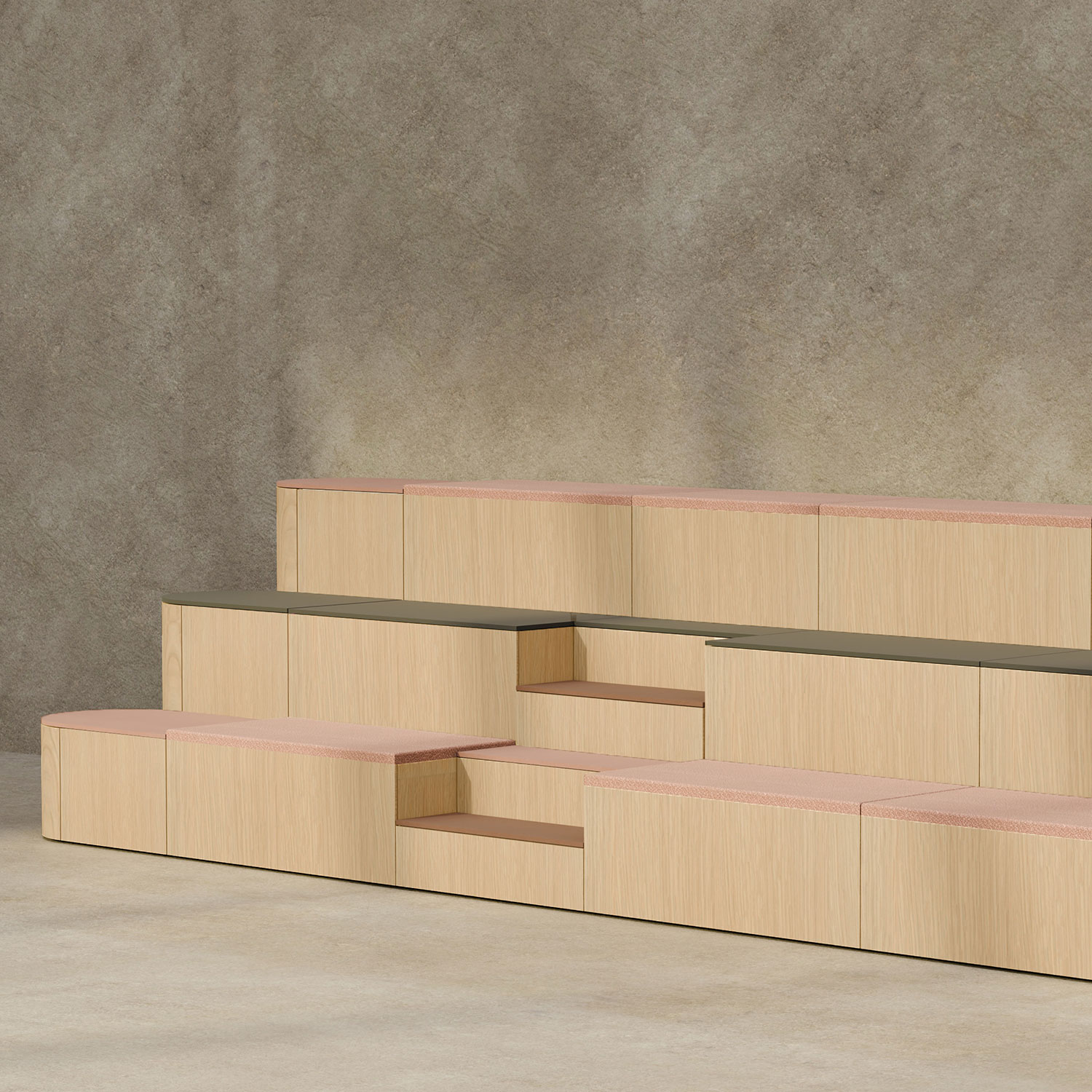 The tiered seating modules are 600mm wide, with the option to add upholstered top panels for extra comfort. Use planter inserts to incorporate biophilia into your space.