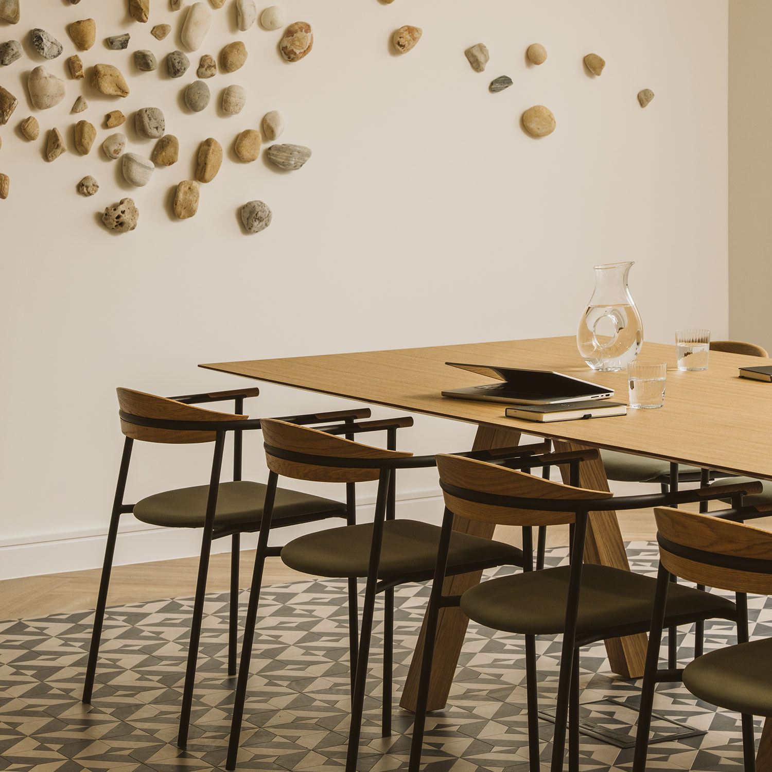 Immediately you are drawn to the familiar form of the chair, exemplified by it’s simple, considered construction using only two distinctive materials – powder coated steel and oak. Katla’s intention is clearly defined, offering a practical solution for dining or casual meeting settings.