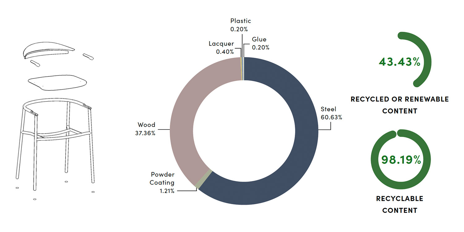 Comprised of two familiar materials, the Katla is considered in its design – using responsible FSC oak for the back and seat, and 100% recyclable powder coated steel for the structure. The chair can be easily disassembled, helping to facilitate a circular life-cycle for the product. For transport, the chair can be stacked efficiently in fours.