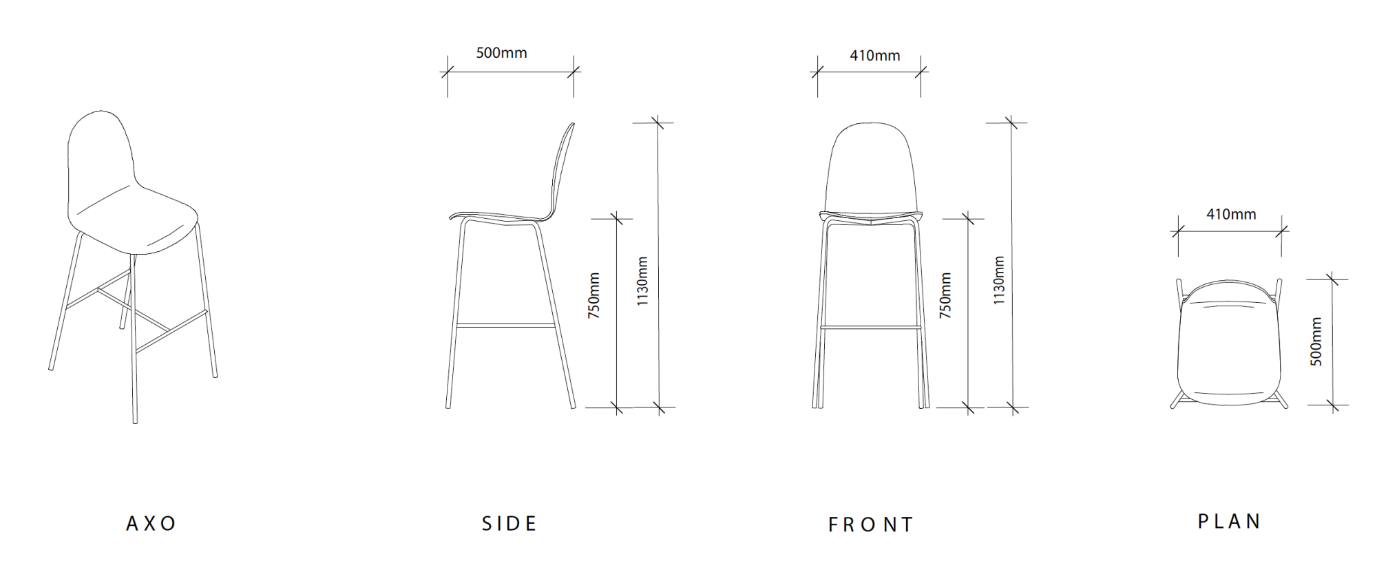 The stool consists of three main parts which, in various colours, can be combined in countless ways. The chair consists of a moulded shell made of treated or painted veneer (with or without structured powder coating) and is available with optional seat upholstery.