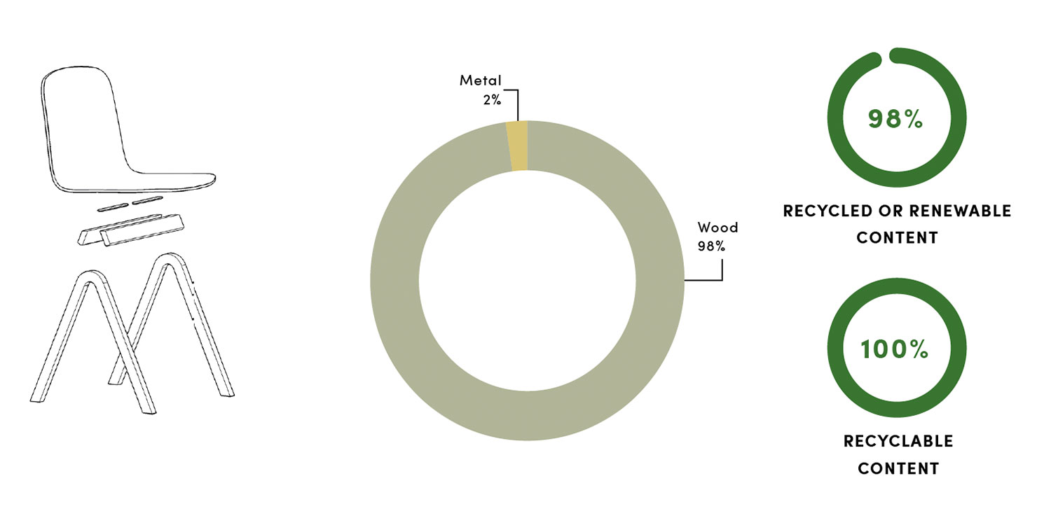 Whether multiplied at scale for auditorium settings, or featured throughout dining areas, the chair can be stacked and stowed away within flexible working environments. While stacked, the chair’s footprint stays the same, allowing for easy storing within tight or minimal storage spaces.